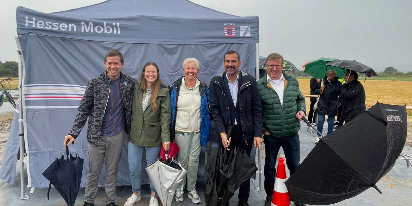 Nach 1,5 Jahren ist er nun endlich fertiggestellt – der neue Fahrradweg zwischen Steinbach und Niederhöchstadt parallel zur L3367. Zur Eröffnung sind der Staatssekretär des hessischen Verkehrsministeriums Jens Deutschendorf und der Präsident von Hessen Mobil Heiko Durth aus Wiesbaden angereist. Gemeinsam mit den beiden Bürgermeistern Steffen Bonk aus Steinbach und Adnan Shaikh aus Eschborn wurde ein Band zur offiziellen Verkehrsfreigabe durchgeschnitten.