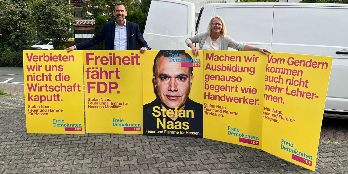 In den Sommerferien sind die Plakate angekommen und Lars Knobloch und Astrid Gemke haben diese entgegengenommen. FDP-Ortsvorsitzender Lars Knobloch: „Die Plakate sind da und jetzt kann es endlich losgehen. Dadurch, dass mit Stefan Naas erstmals ein Steinbacher Spitzenkandidat bei einer hessischen Landtagswahl ist, sind wir als FDP Steinbach dieses Mal besonders gefordert. Ich bin mir aber sicher, wir werden mit einem engagierten Wahlkampf unseren Teil zu einer erfolgreichen Landtagswahl für Stefan Naas und die hessische FDP beitragen. Ich freue mich auf den Wahlkampf mit unserem starken Team! Feuer und Flamme für Hessen.”