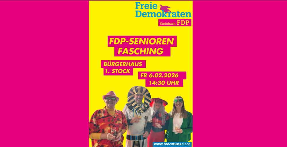 Die FDP Steinbach lädt alle Seniorinnen und Senioren herzlich zum diesjährigen Seniorenfasching ein. Gefeiert wird am Freitag, den 06. Februar, ab 14:30 Uhr in den Clubräumen im Bürgerhaus (1. Stock).