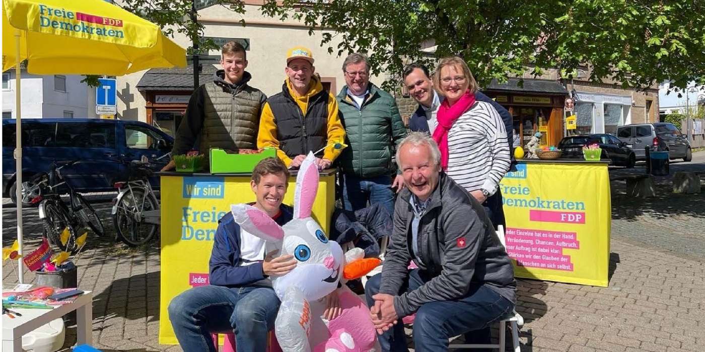 Am Ostersamstag veranstaltete die Steinbacher FDP am Freien Platz eine kleine Aktion passend zu Ostern. Unter Federführung von Markus Wittek, der das Orga-Team der Liberalen seit einigen Jahren leitet, wurde Eierlaufen, Sackhüpfen und Malen für die vorbeischauenden Bürger*innen angeboten. Zudem gab es Äpfel und Süßes.